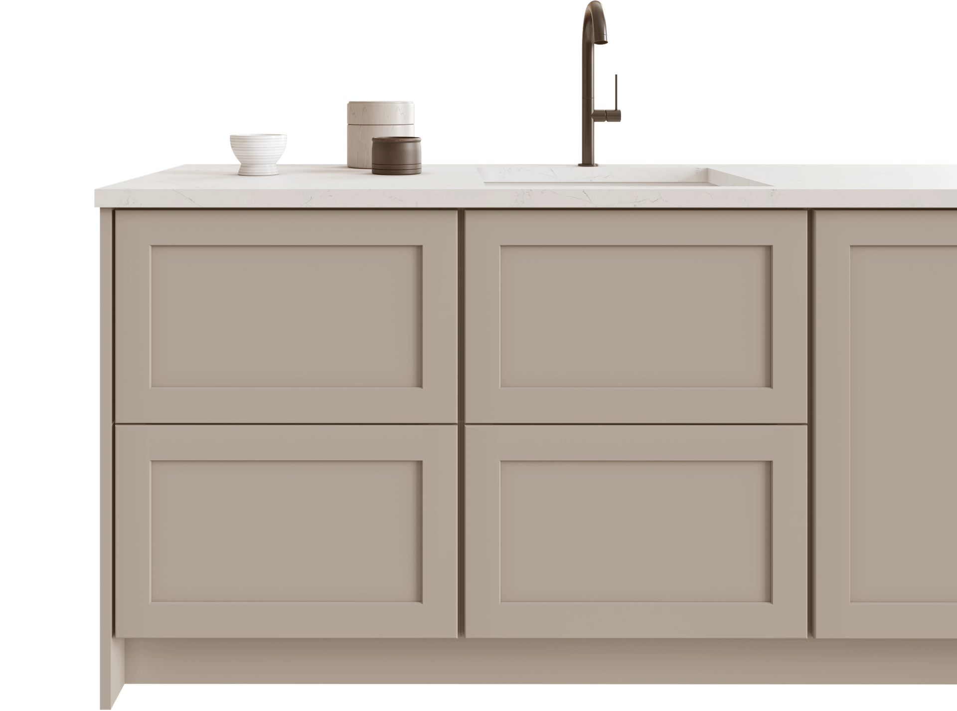 Allure doors feature classic solid wood stiles and rails with an MDF center panel designed to enhance stability and minimize movement. Concealed soft-close hinges ensure precise alignment and controlled closing.